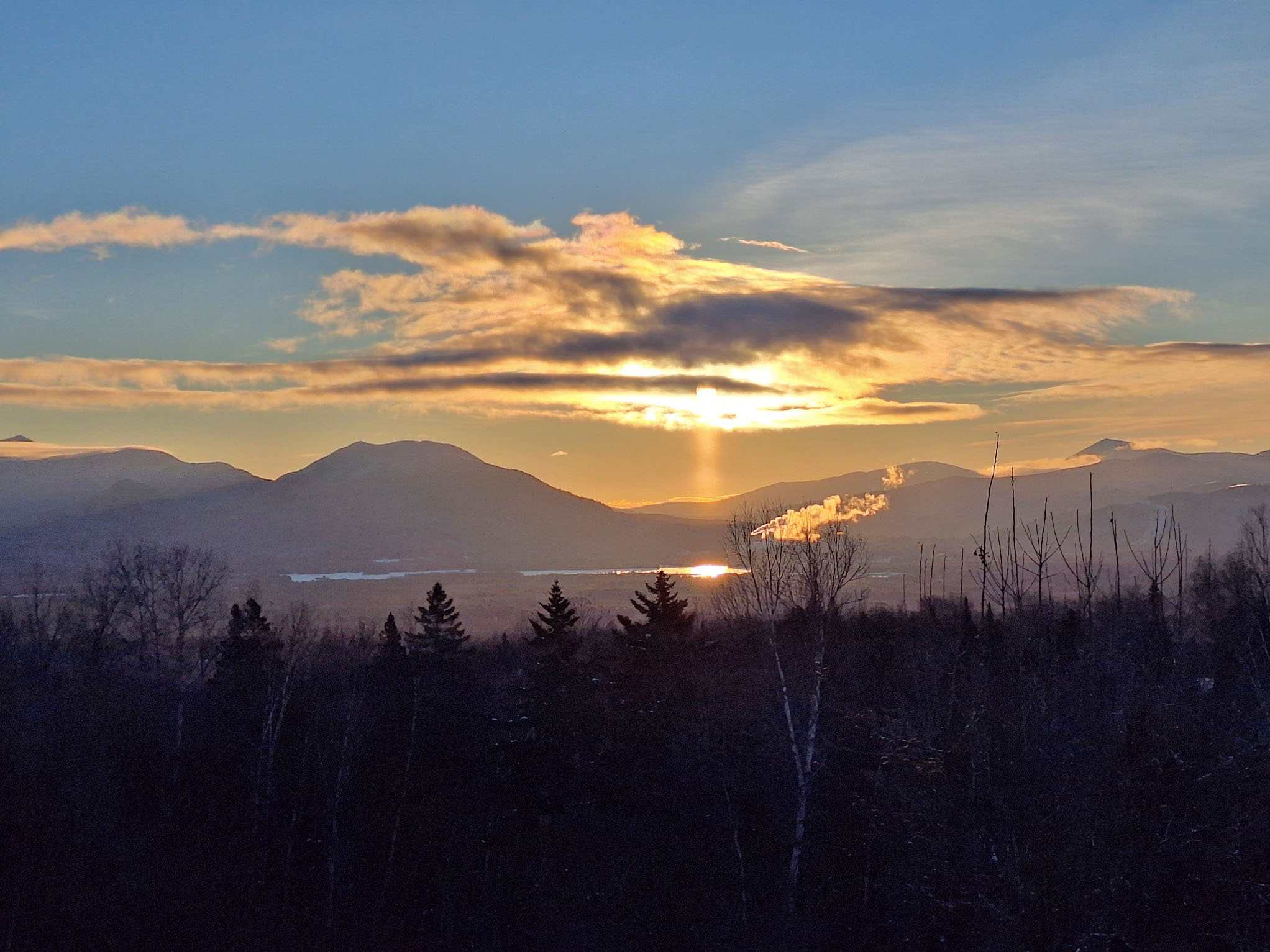 Although Sun pillars are usually seen above the Sun, under the right conditions they can also be seen below. On January 6, 2024 the disk of the Sun was obscured by a narrow band of cloud which rendered the lower Sun pillar more easily visible. In this case sunlight is being reflected off the top tiny ice crystals suspended in the air. At the pillar's base, the light is reflected off the ice in Flagstaff Lake.