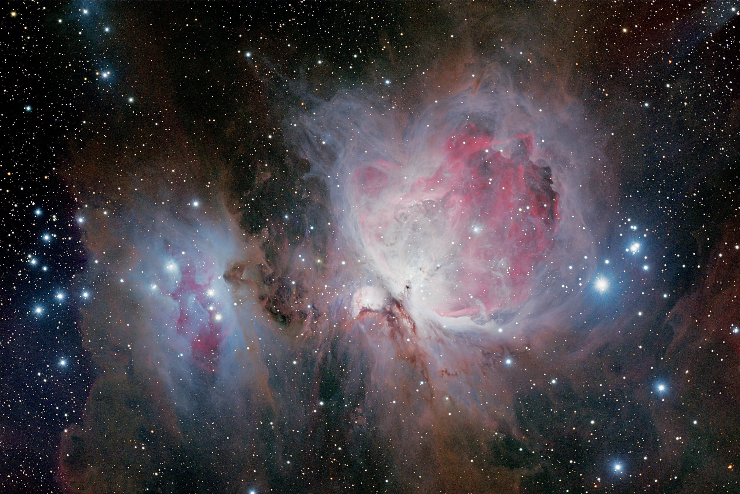 Near the very brightest part of the nebula, it is possible to discern a tight group of 4 stars. This is the well-known Trapezium Cluster which is 1½ light years in diameter.