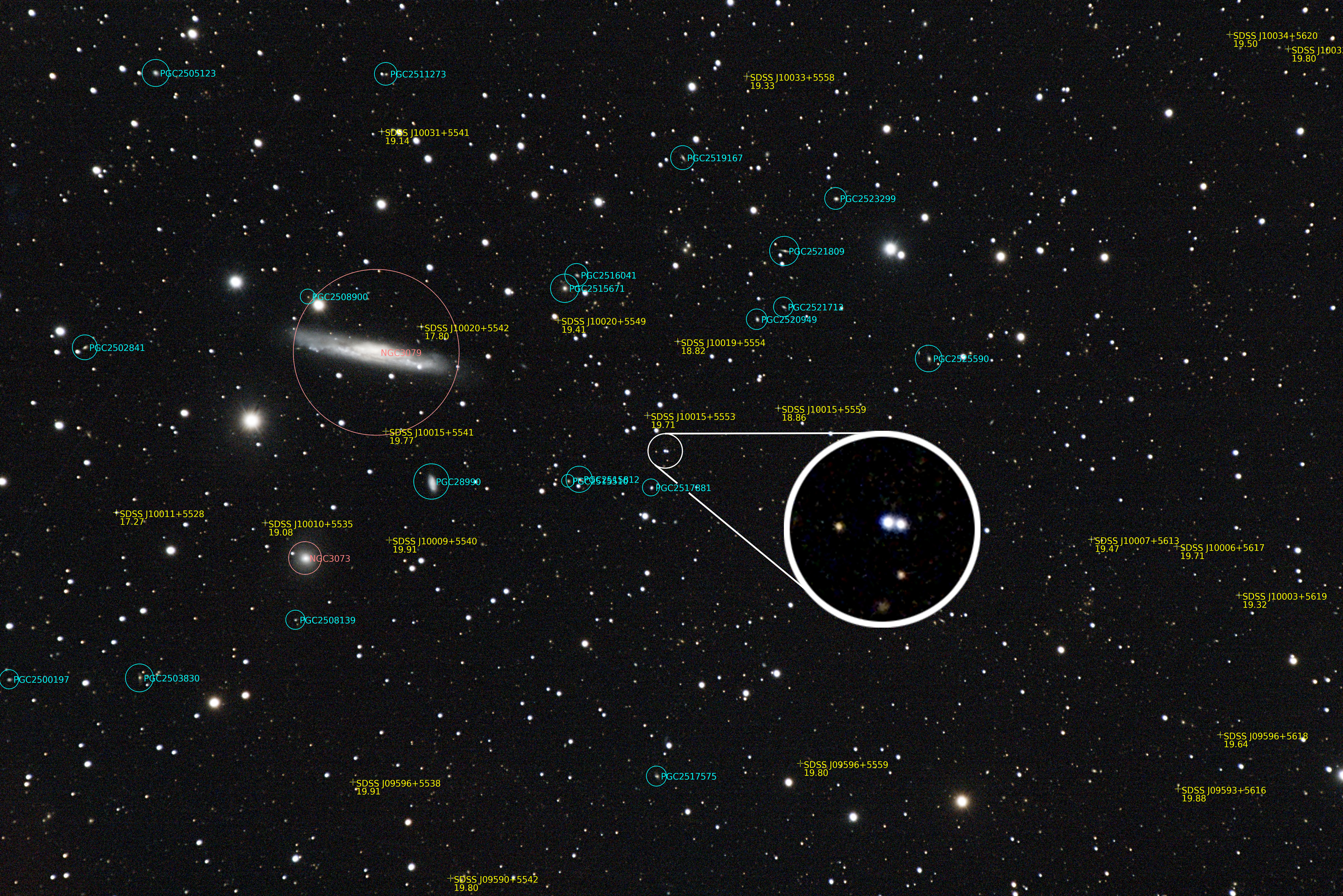 The inset is a 3h10m exposure taken with a 5 inch telescope over 2 nights in April 2023 from Eustis Ridge. Objects fainter than 20th magnitude are visible in the image. This is 250,000 times fainter than the human eye can see and is only attainable in the very darkest of skies.