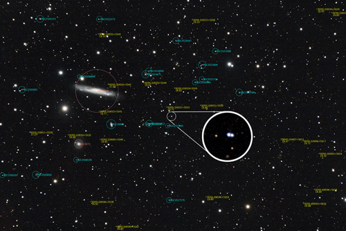 Elsewhere in the image cataloged galaxies are circled and labeled. Yellow crosses indicate other quasars along with their catalog number and visual magnitude below. Most of these are very faint and tremendously distant. The light from the brightest one, to the left of the image, had been traveling through space for 10.4 billion years before finally striking the Earth at Eustis Ridge in April of 2023. That is more than twice the age of the Sun and solar system!