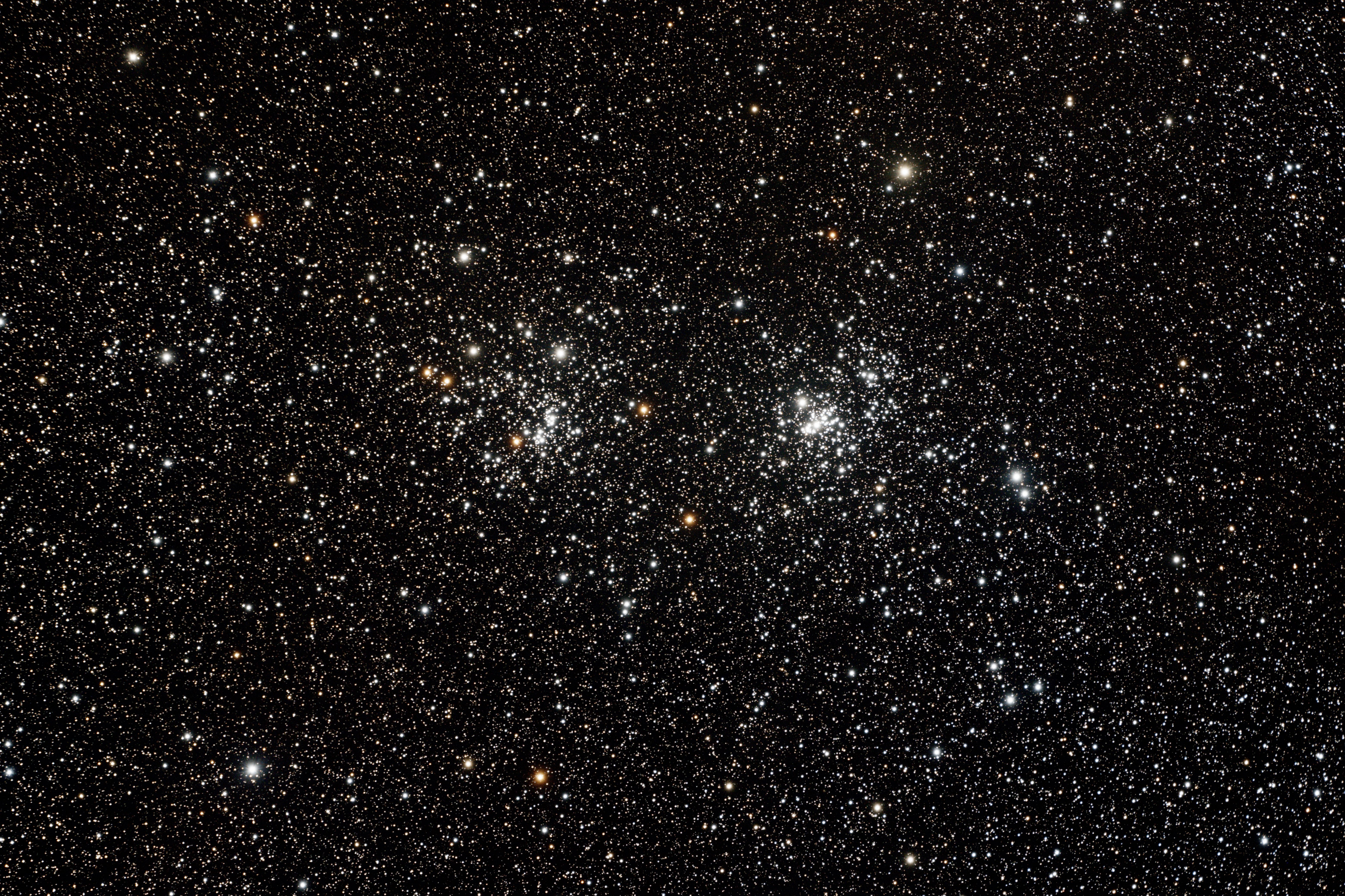 Under Eustis' dark skies the Double Cluster is easily visible with the naked eye as a fuzzy patch to the left the W shape formed by the stars of the constellation of Cassiopeia the queen. Lying at a distance of 7,500 light years. The two components, often designated χ Persei (left) and h Persei, weigh in at 3,700 and 4,700 solar masses respectively. These clusters are comprised of hot, young, massive stars that form the core of the Perseus OB1 Association and are only about 14 million years old.