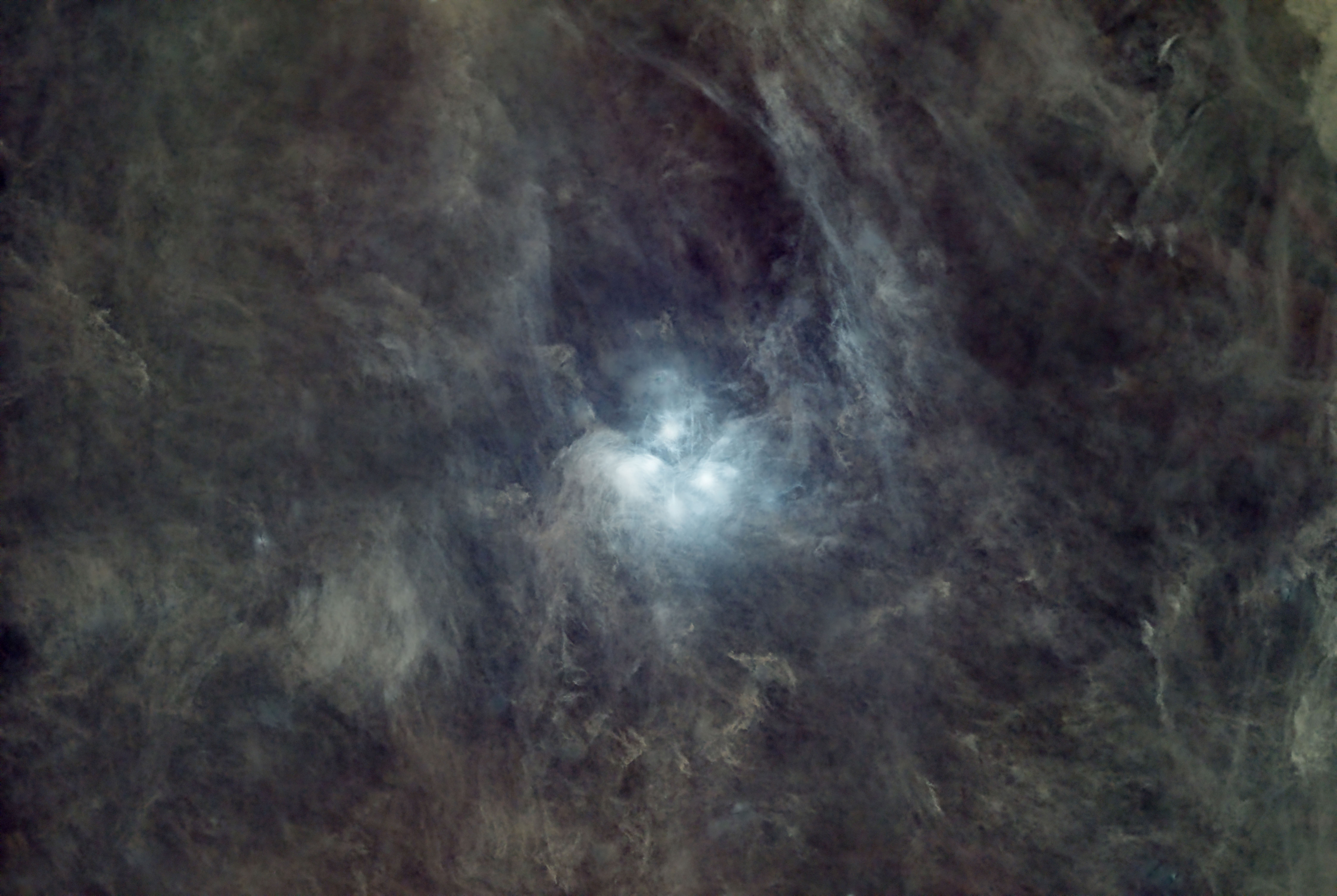 They are seen here illuminating gossamer folds of nebulosity but this is a chance encounter with dust in the interstellar medium and not material left over from the cluster s formation. It has been determined stars are moving at 18km/s (11 miles per second) relative to the dust in the nebula.