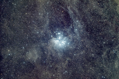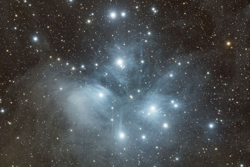 The Pleiades or Seven Sisters are clear stand-outs in the winter sky. At a distance of 444 light years, they are one of the closest star clusters to Earth. They are also relatively young, having been formed within the last 100 million years.