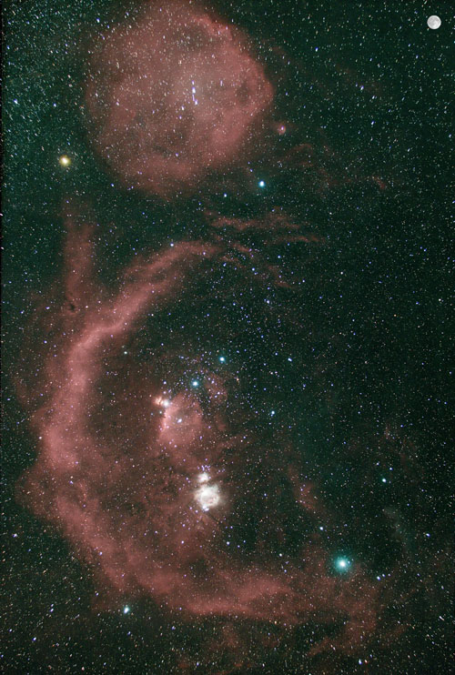Orion is also home to a large complex of nebulosity dominated by a 10° diameter arc known as Barnard’s Loop. The brightest parts of it are only barely detectable to a keen-eyed visual observer under the very best of conditions and its full extent was discovered photographically. Many of the brighter stars in this image belong to the Orion OB1 association which is a collection of hot, short-lived giant stars. It has been estimated that 10-20 supernovas exploded in this region within the last 12 million years and Barnard’s Loop is likely a bubble blown out by one of them. At the top of the image, where Orion's head would be, is the Lambda Orionis Ring (Sh2-264) sometimes called the Angelfish Nebula. It may also be a supernova remnant. The field of view is 17.3°×25.7°. For scale the disk of the Full Moon has been superimposed at top right.